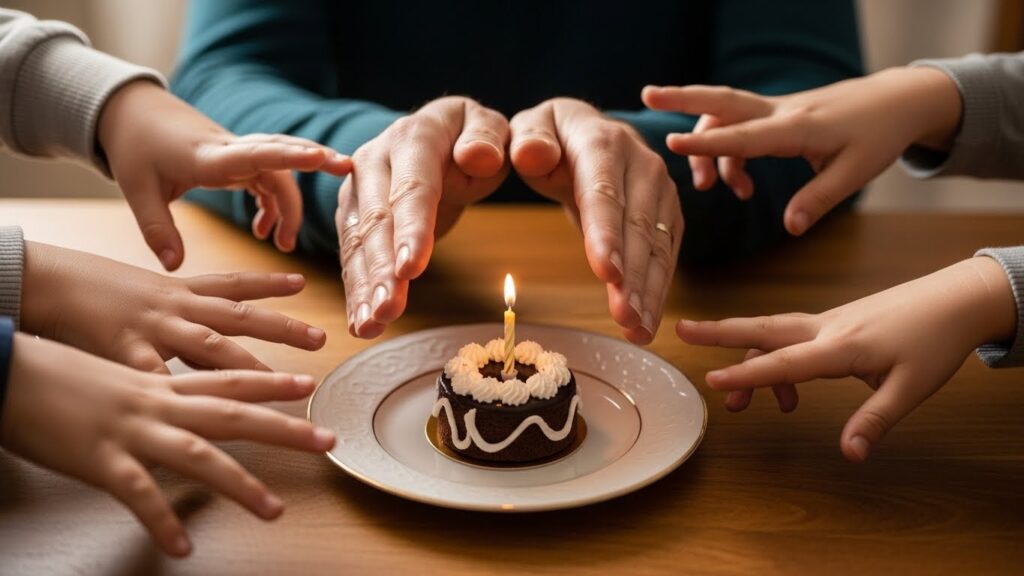 As we gathered around the cake, I took a moment to make a wish. The candles were still smoking when Jessica grabbed a fork and went straight for the corner piece with the most frosting flowers. I instinctively slapped her hand away – not hard, but enough to stop her.