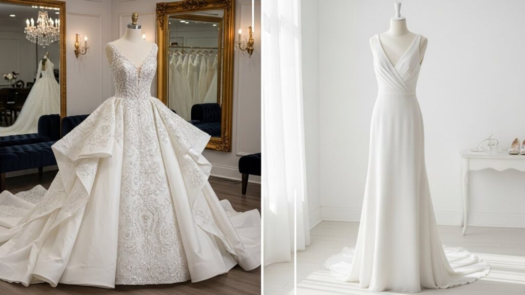 It all started when my mom and future mother-in-law insisted on coming dress shopping with me. I had a vision: a simple, elegant sheath dress with delicate lace details. But my mom had other ideas. She dreamed of a huge, poofy ballgown—the kind with layers of tulle and a train that could trip an entire bridal party.