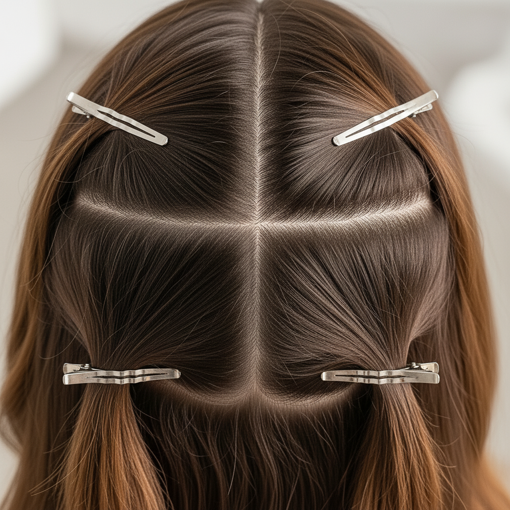 Part your hair down the center from forehead to nape, then create a horizontal part from ear to ear. This gives you four clean quadrants: front left, front right, back left, back right. Clip each section up and out of the way.