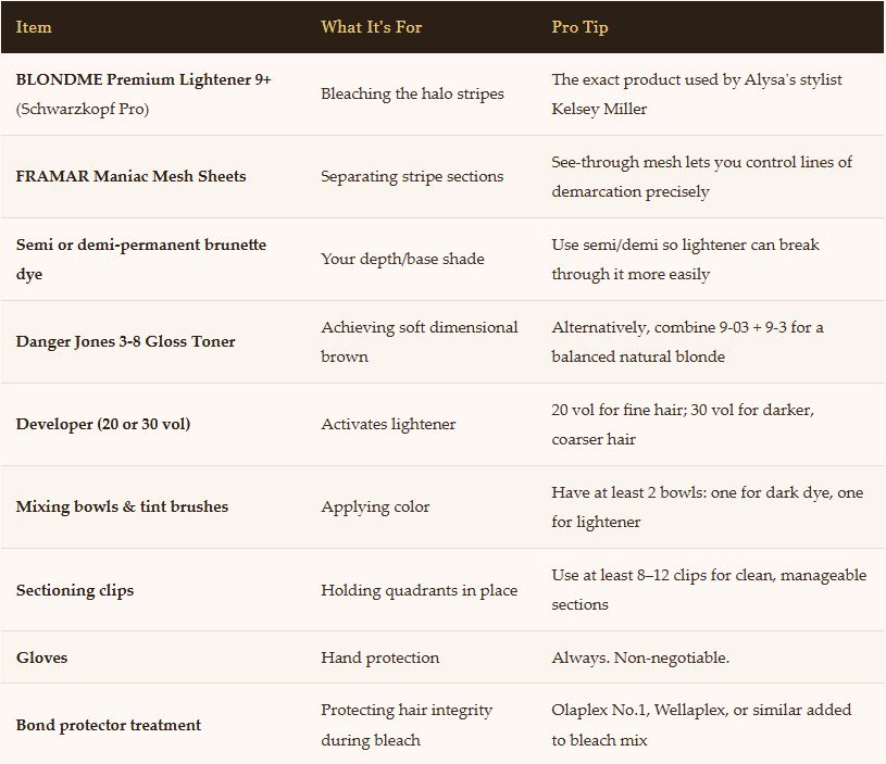 Hairstylist Kelsey Miller used Schwarzkopf Professional’s BLONDME Premium Lightener 9+ for the bleaching. Colorist Kelly Novobielski recommended FRAMAR Maniac Mesh for clean sectioning, and Danger Jones toners for the final blonde shade (3-8 for soft dimensional brown; 9-03 + 9-3 for balanced natural blonde).