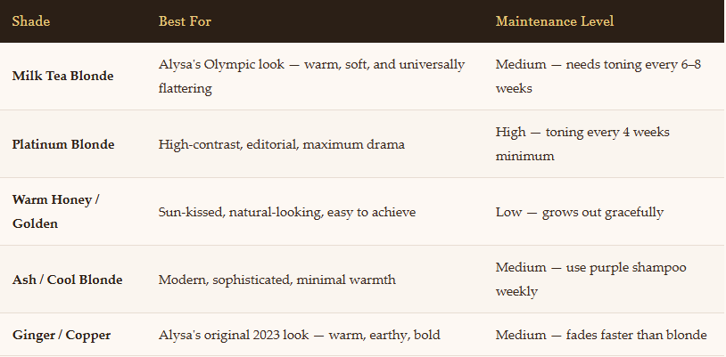 Alysa Liu DIY’d the first few rings herself at home. For medium to dark brown hair going for a copper or honey blonde result, yes, it’s very doable at home with the right supplies. However, if your hair is very dark and you want the milk-tea or platinum result Alysa had at the 2026 Olympics, a professional colorist is recommended for the bleach portion.