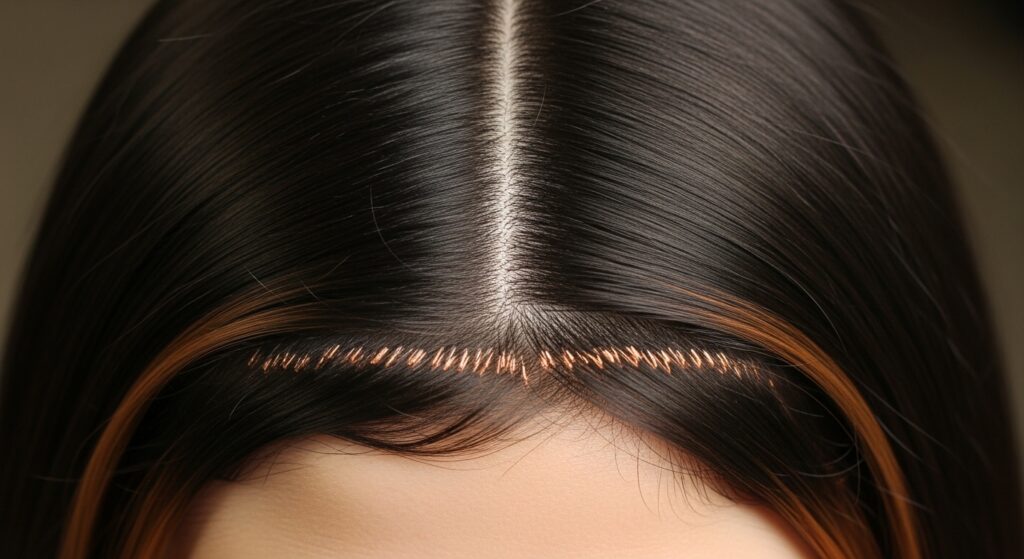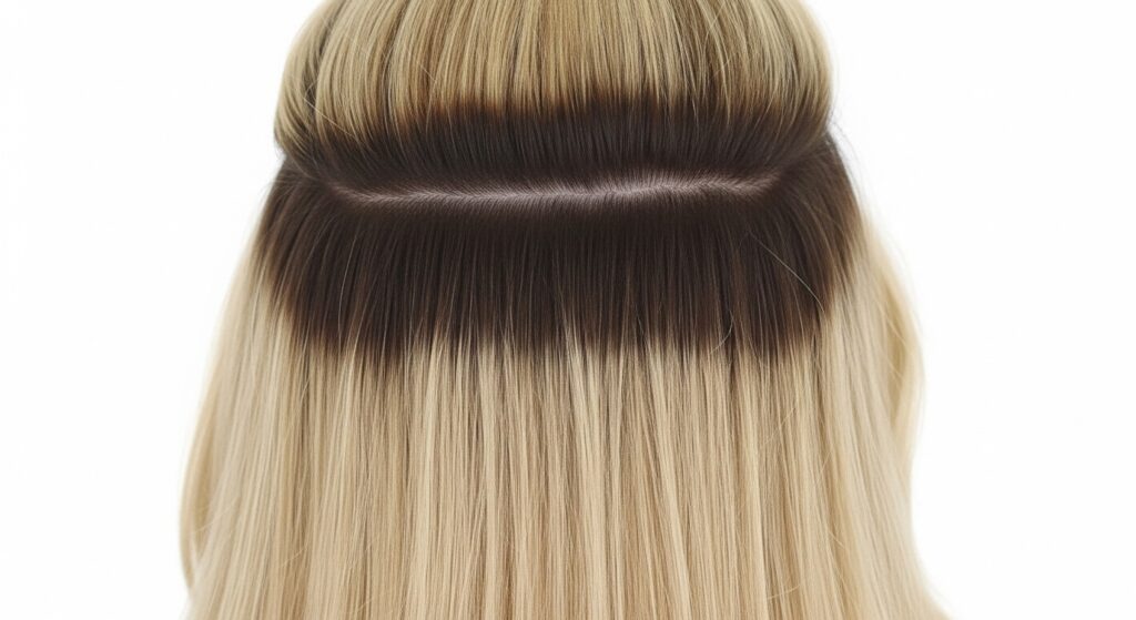 To avoid a solid, dark “cap” at the top, stylists often weave in tiny, fine babylights right at the part line and around the face within the shadow root section.