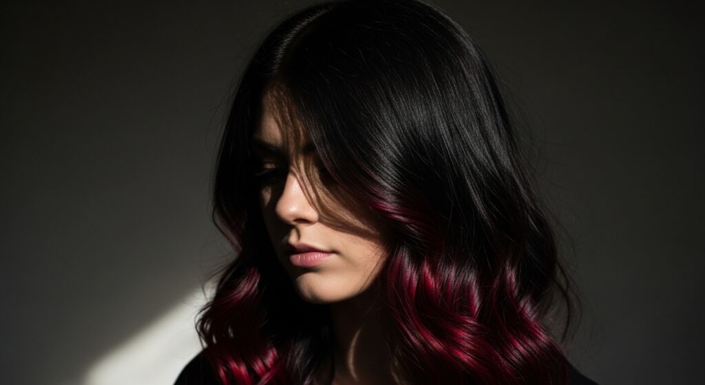 The contrast is softer but just as stunning. It adds movement without going blonde. This can be a beautiful, subtle base for romantic goth hairstyles, adding depth to dark waves.