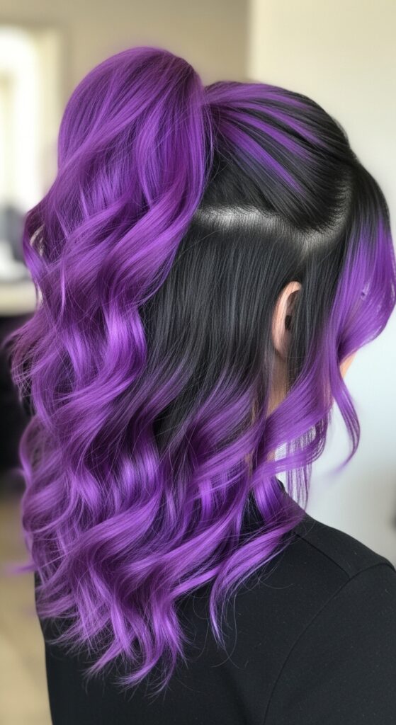 Applying violet balayage specifically to those dramatic front sections or the long back pieces creates an incredible focal point. It’s a conversation-starting look that blends tradition with ultra-modern color.