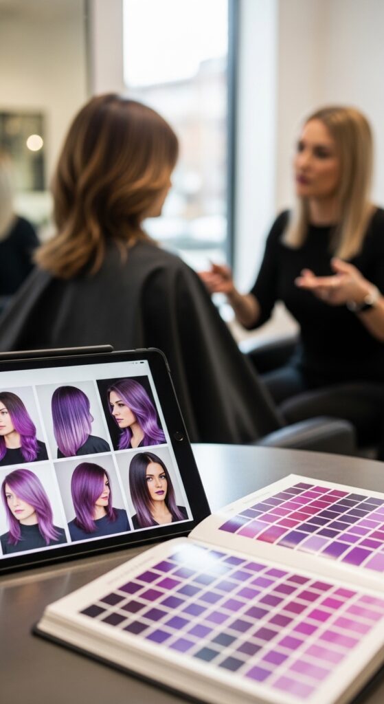Walking into the salon prepared is key. Don’t just say “violet balayage.” Bring inspiration photos that show the depth and subtlety you want. Be clear about how bold you’re willing to go.