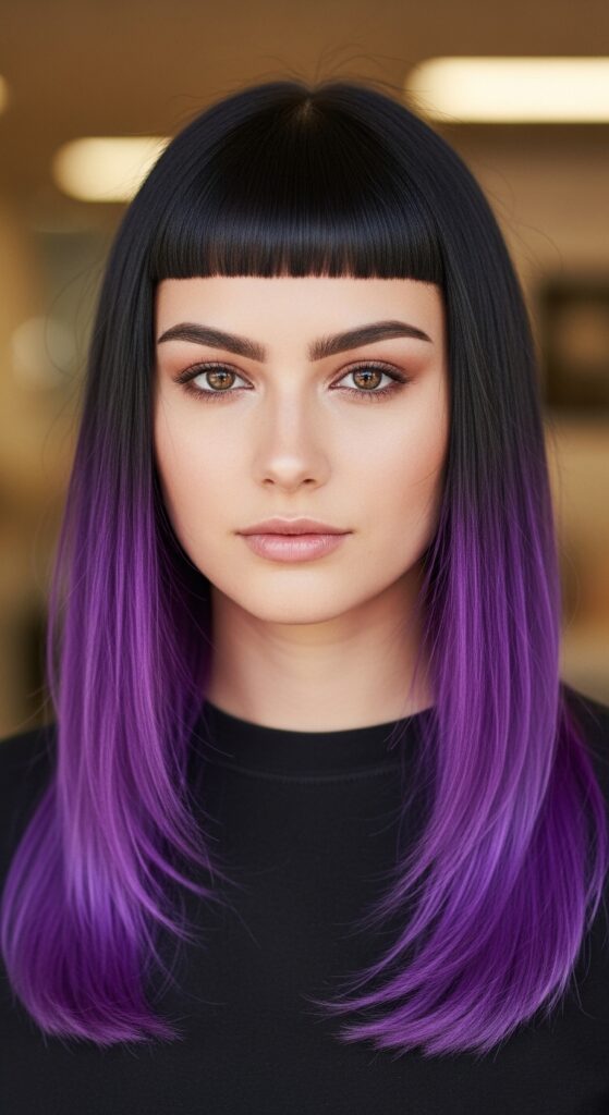 Want full romantic goth? Enter the vampire haircut. Think dramatic, heavy bangs (like a curtain or micro-fringe) with long, layered hair. When you add dimensional violet balayage to this cut, it’s next-level.