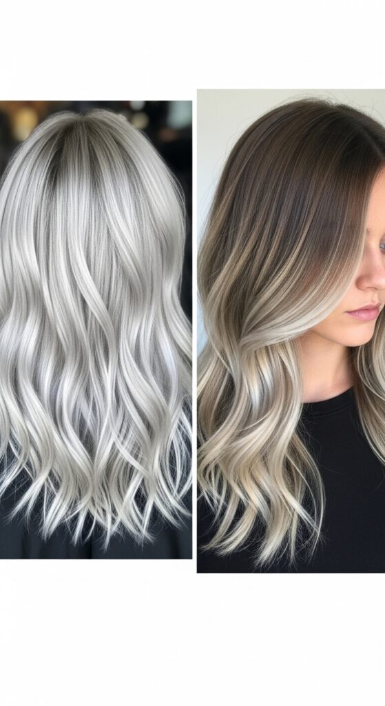 “Balayage” is the hand-painted technique that gives a soft, natural grow-out. Put it all together, and you get a seamless blend of ultra-light, cool blonde tones painted throughout your hair. The result is depth, dimension, and that signature platinum glow without a harsh root line.