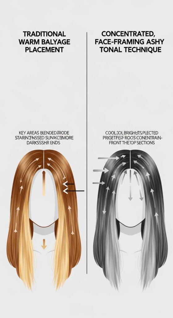 Traditional balayage often aims for a sun-bleached, warmer effect. This technique is the opposite. The placement is strategic to create a bright, face-framing effect while keeping the overall palette very cool and concentrated.