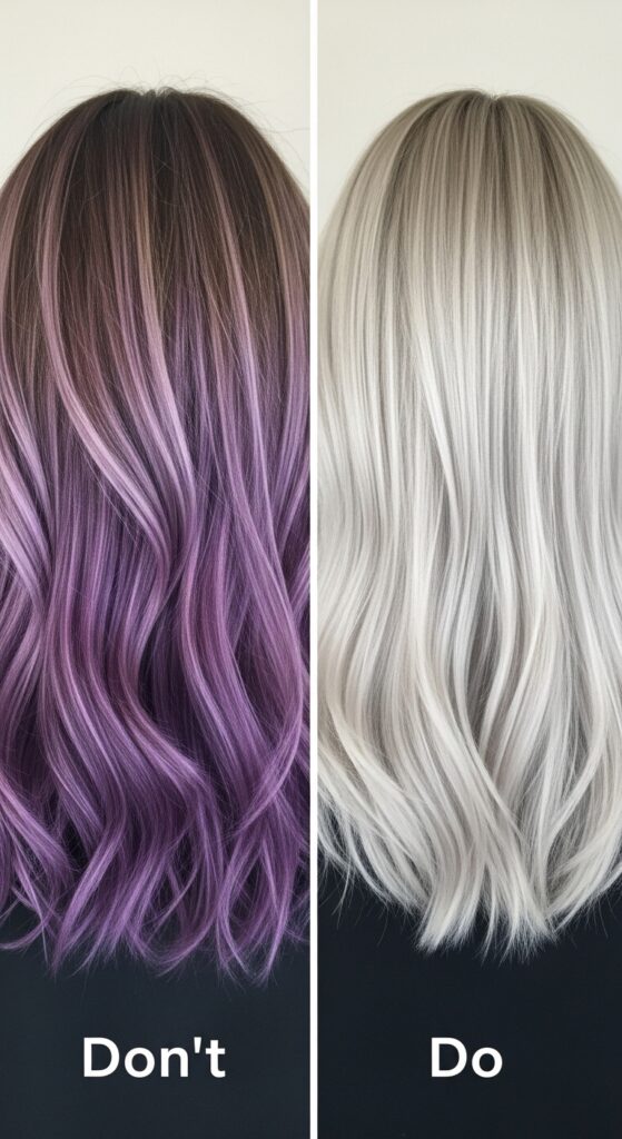Using a purple shampoo too often can lead to a purple cast. Stick to once a week. Avoid hot tools without protectant, as heat damage can make hair look brassy and dull.