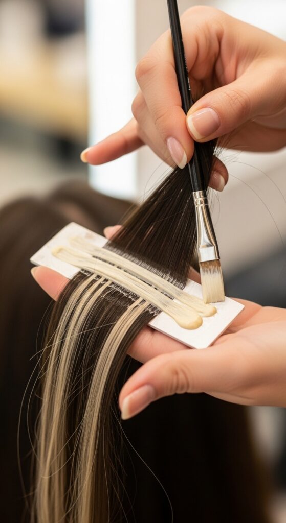 - Painting:The colorist hand-paints the lightener onto select sections, focusing on mid-lengths to ends and framing the face.