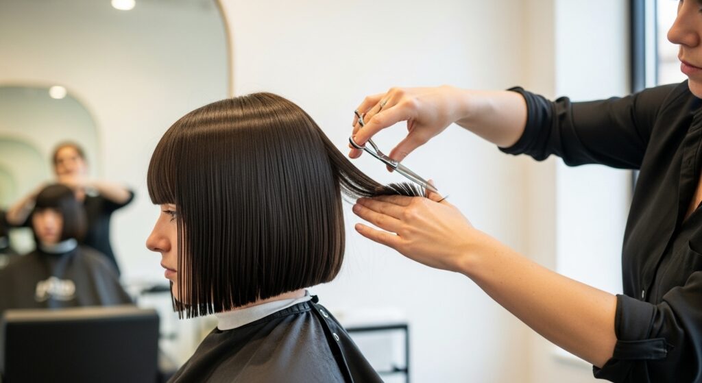 2. Consult a Skilled Stylist: Do not trust this cut to just anyone. Look for a stylist whose portfolio showcases precision cuts and bobs. During the consultation, be clear about your lifestyle and how much time you’re willing to spend on styling each day. A good stylist will advise you on the most flattering length and version for your face shape and hair type.