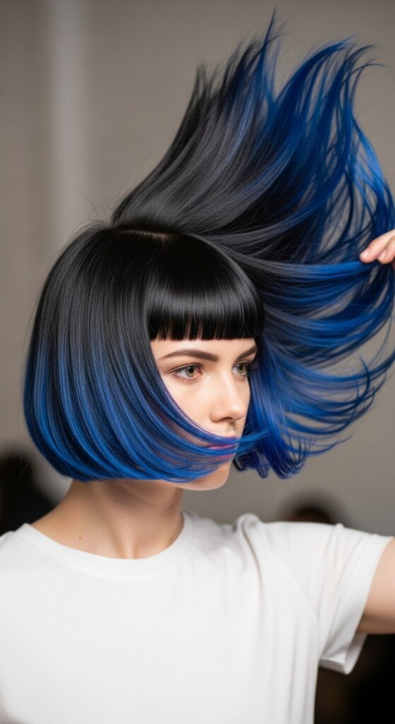 You don’t need all-over color. Try blue just on the underlayer of a hime cut for a hidden surprise. Or add blue tips to an asymmetrical lob.