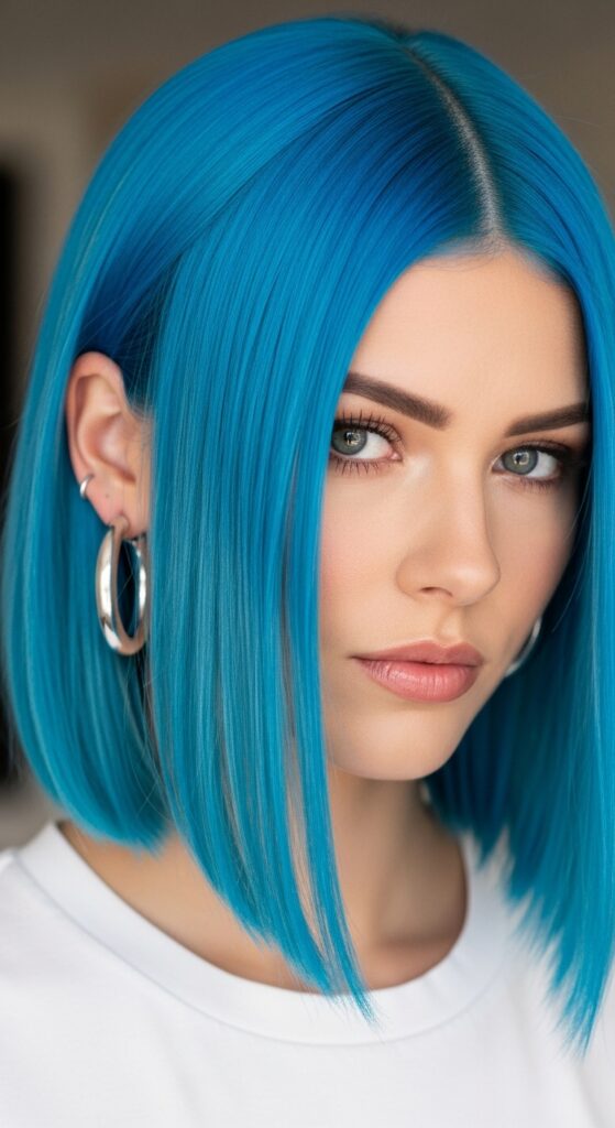 Blue hair makes a statement on its own, so keep styling simple. Sleek, straight hair shows off the color block beautifully. So does a simple, clean quiet luxury bob.