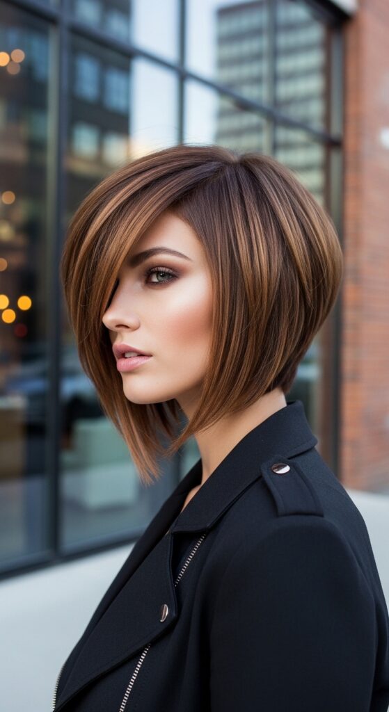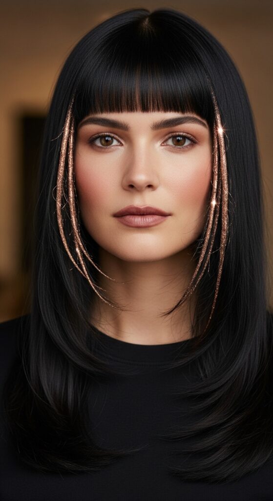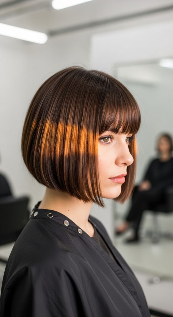 Imagine the bronze foils framing your face within that sharp fringe. It’s a powerful, editorial mix of structure and organic warmth.