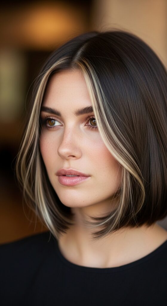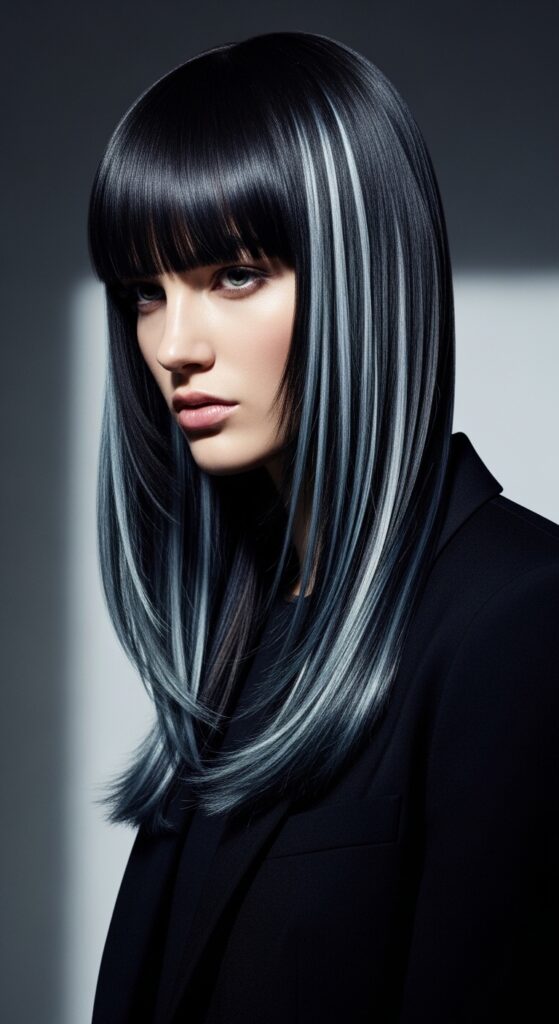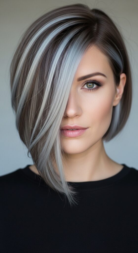 A blunt quiet luxury bob with mercury streaks feels incredibly chic and expensive. For something more dramatic, pair it with a hime cut or the layered, textured vampire haircut.