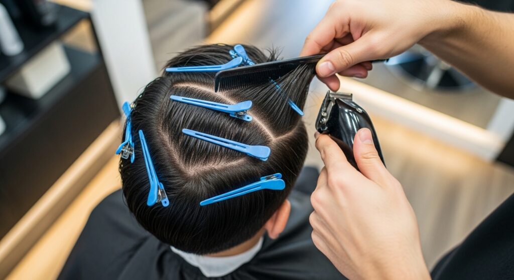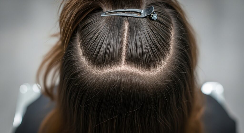 Clip the top section up and out of the way. You’ll start applying the powder to the underneath layer first. This builds a solid foundation of lift that the top layers will sit on.