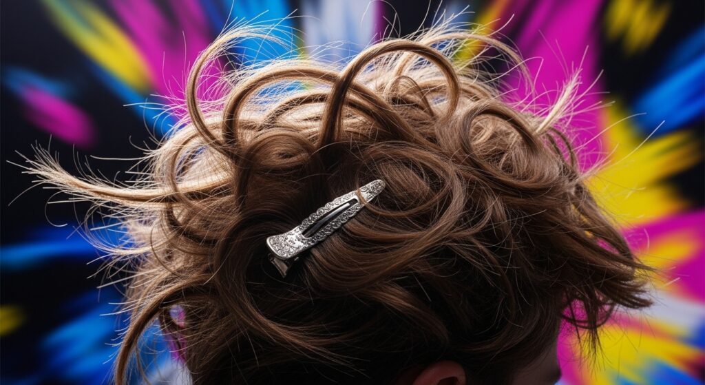 Glitchy glam hair is playful and intentionally “off.” It might have a random braid, a twisted section, or a pin that doesn’t match. The volume should feel the same—unexpected.