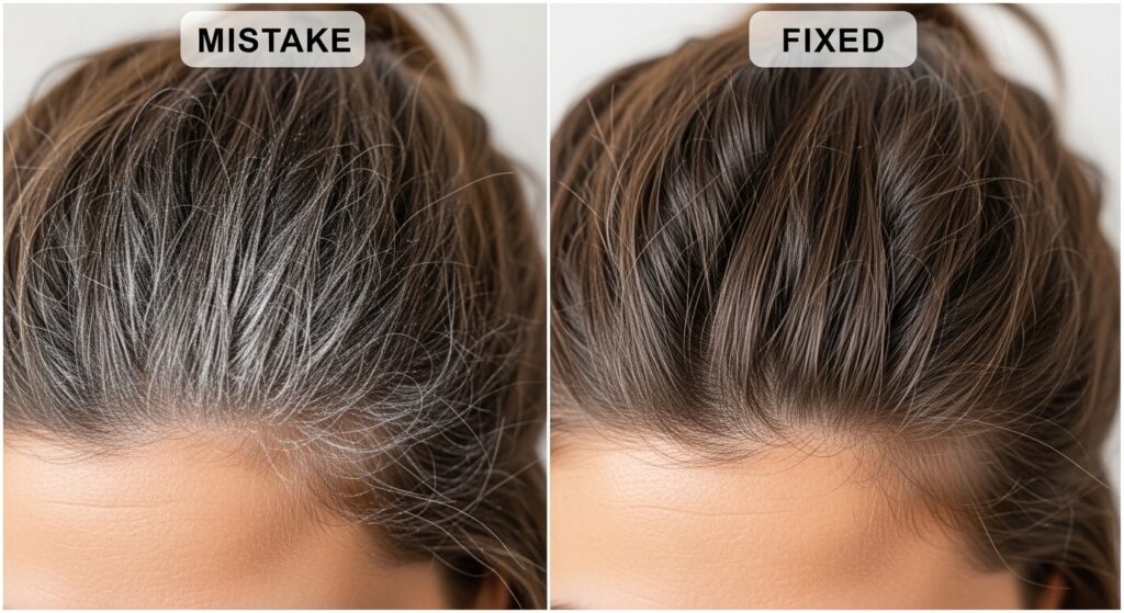 You can also use a tiny bit of dry shampoo on a brush to help absorb excess powder. Another mistake is not blending, which leads to a visible white residue. Always massage and brush!