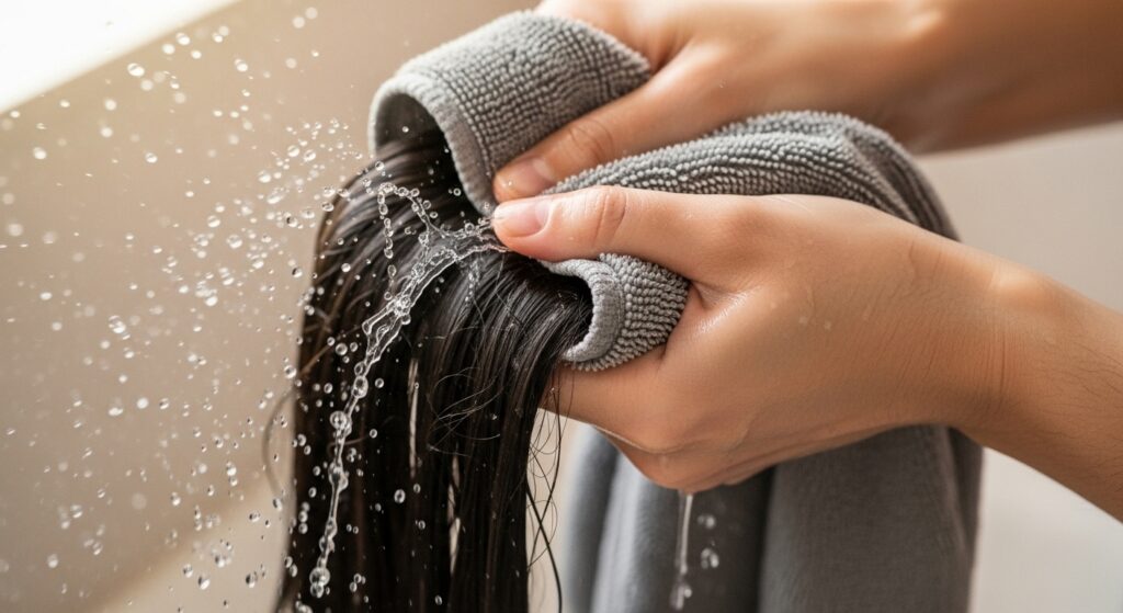 Use a soft microfiber towel or an old cotton t-shirt. Gently squeeze the water from your hair from the ends upward. Avoid rough rubbing, which causes frizz and tangles.