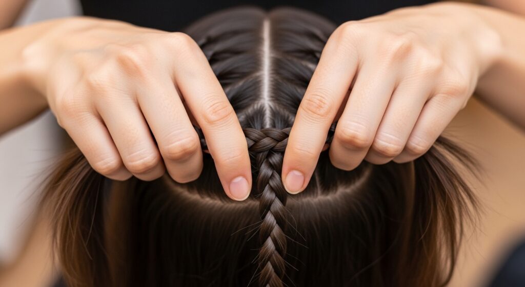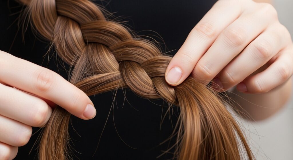 Imagine you’re giving each strand a gentle, consistent hug. Not so tight it hurts your scalp, but firm enough that the braid feels secure and doesn’t sag.