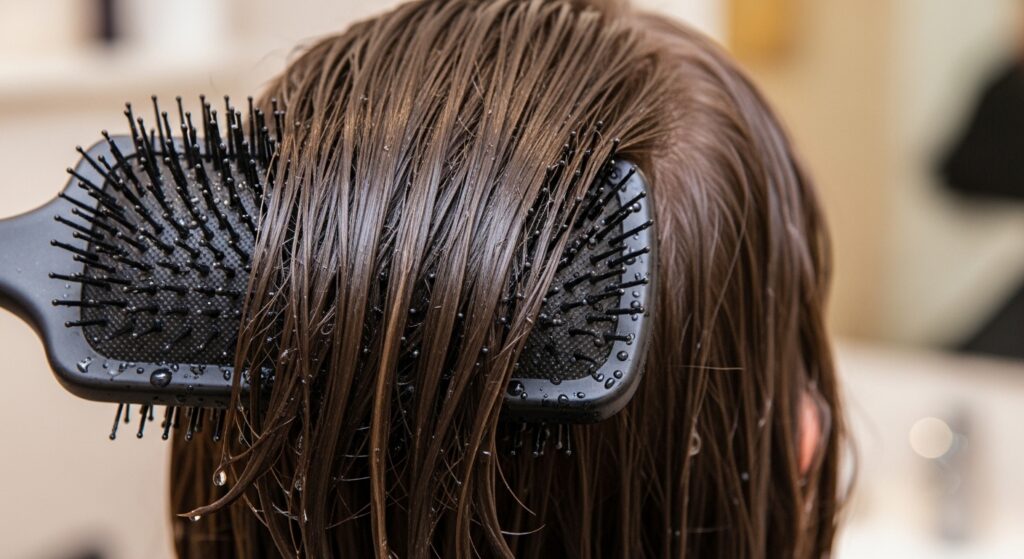 Once your product is applied, use a gentle paddle brush or a wet brush to distribute it perfectly from roots to ends.