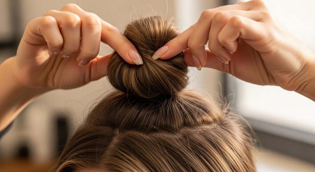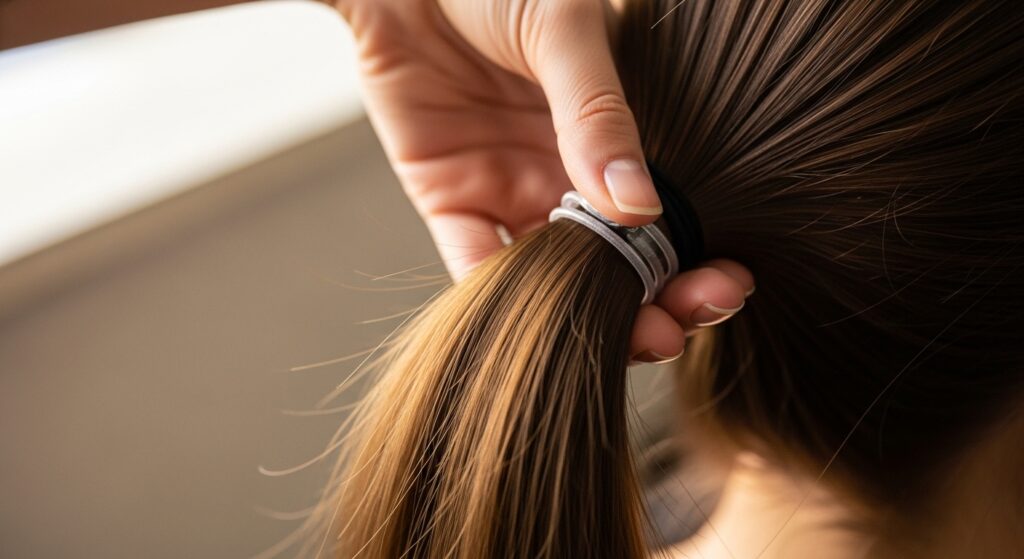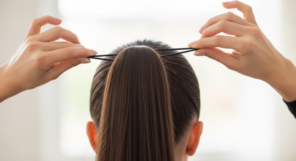Don’t worry about being perfect. A little volume at the crown is great. Pull the ponytail tight—this first elastic is the anchor for your whole style. Smooth any bumps with your hands or a brush.