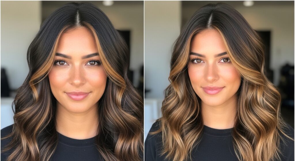 - Ask for: “Warm, tonal caramel highlights woven through a chocolate brown base.”