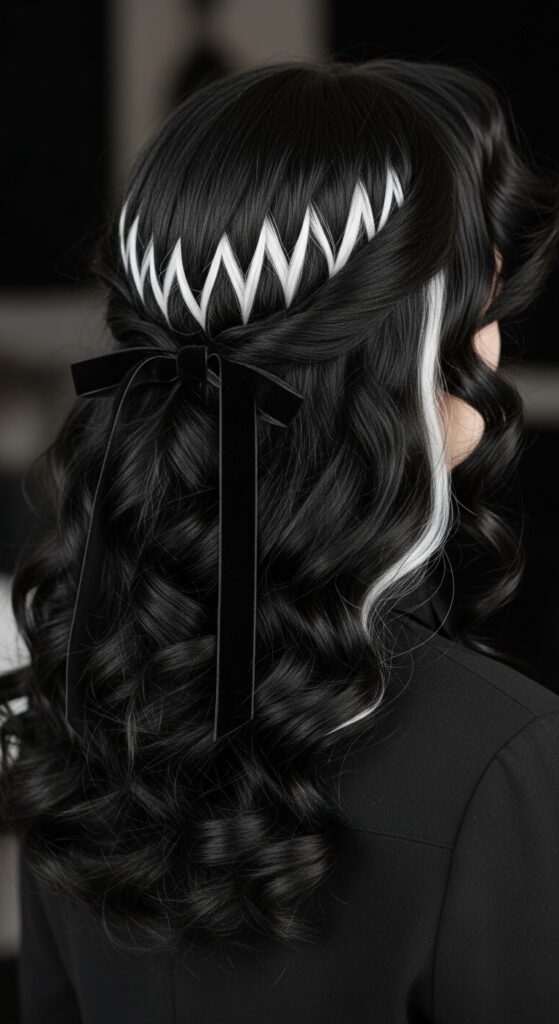 Romantic goth hairstyles thrive on contrast. Imagine a cascade of dark, voluminous curls or waves, divided by a crisp, light-scalp-revealing zigzag part. It’s poetic and powerful, like a dark romance novel cover.