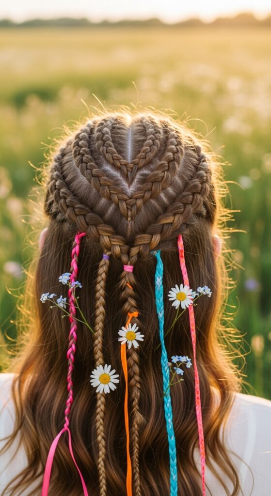 The zigzag part means your braids will naturally fall in a more dynamic pattern around your head. Add some ribbons or thread through some fresh flowers where the braids begin for that perfect eclectic festival look.