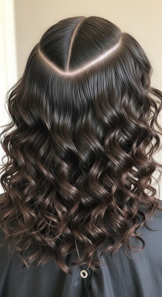 Scrunch the waves lightly to break the cast slightly, but keep the roots sleek. The contrast between the glossy, structured part and the soft waves is incredibly chic and perfect for evening.