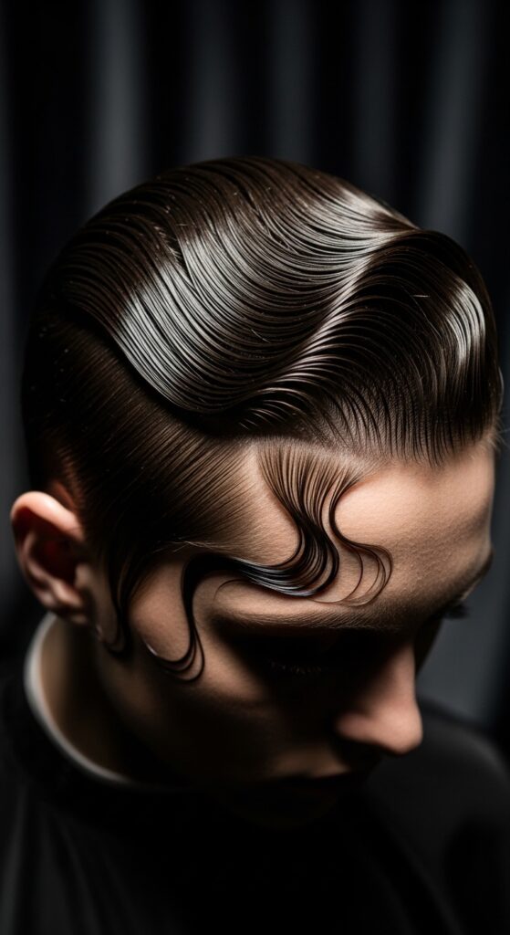 The wet look is still going strong. For a fresh take, combine it with a sharp zigzag part. Apply a strong-hold gel throughout damp hair, carve your part, and then use a curling wand to create deep, defined waves.