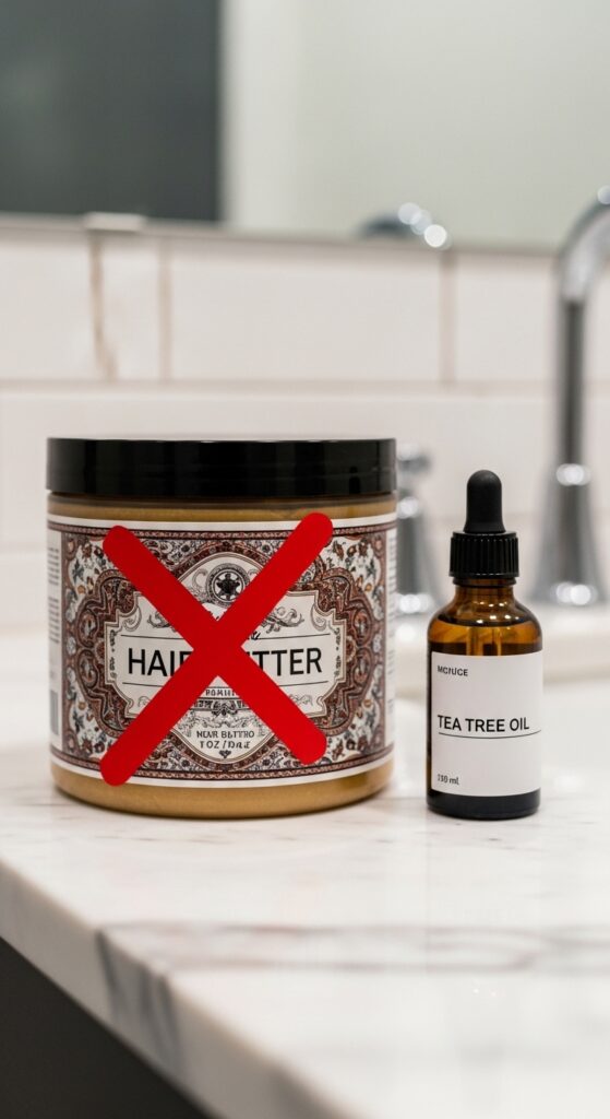 - Heavy Oils & Butters: Coconut oil, shea butter, and pomades can feed yeast. Pause them.