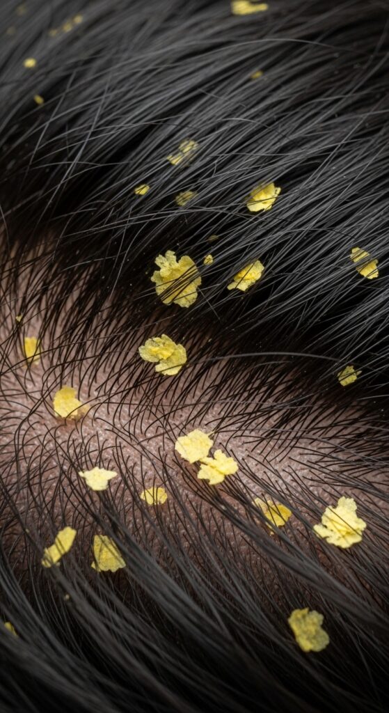 Persistent, oily-looking flakes that are yellowish or white are a big clue. Regular dandruff tends to be drier. The itch is also often more intense and focused in specific spots.