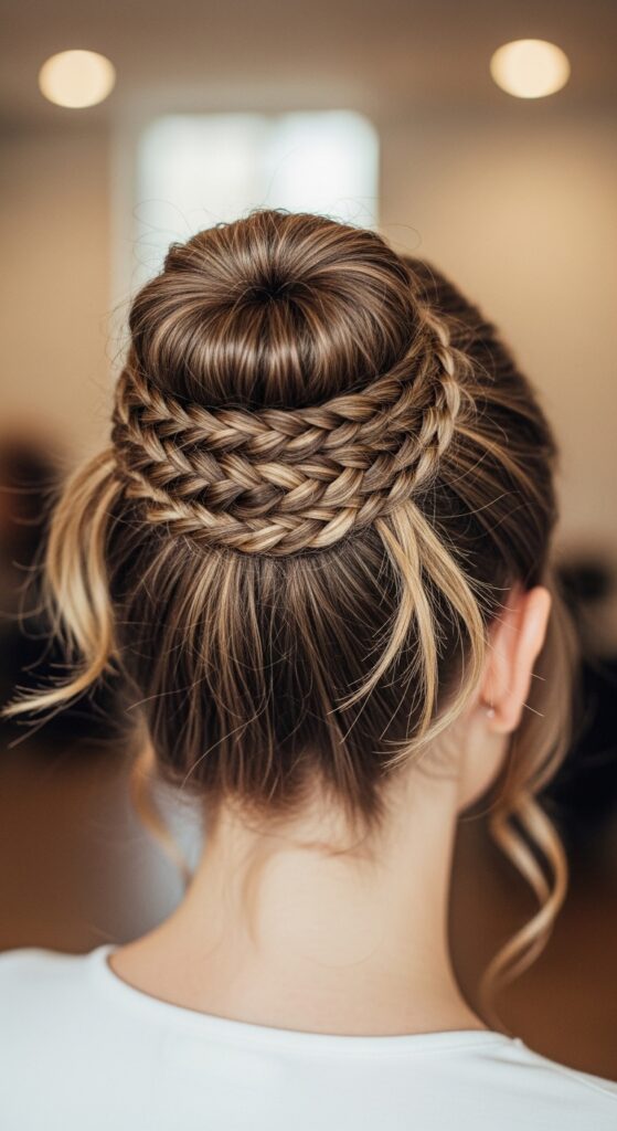 Create 3-4 small braids (any type!) in random sections of your hair. Don’t make them perfect. Then, gather all your hair, including the braids, into a low bun or twist. Use the ends of the braids to wrap around the base and pin.