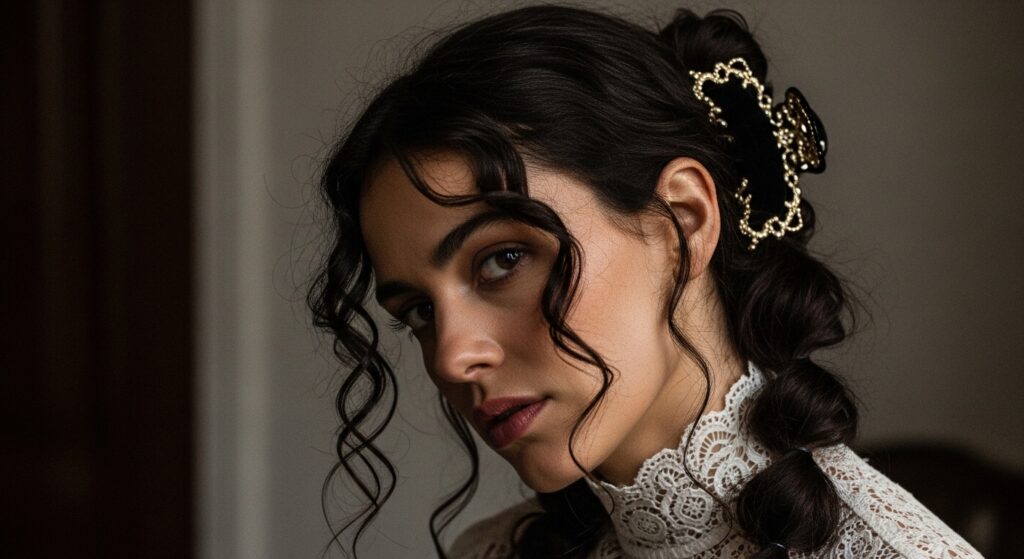 Love the drama of romantic goth hairstyles but need it daytime-appropriate? The claw clip is your gateway. Start with deep, dark waves or curls.
