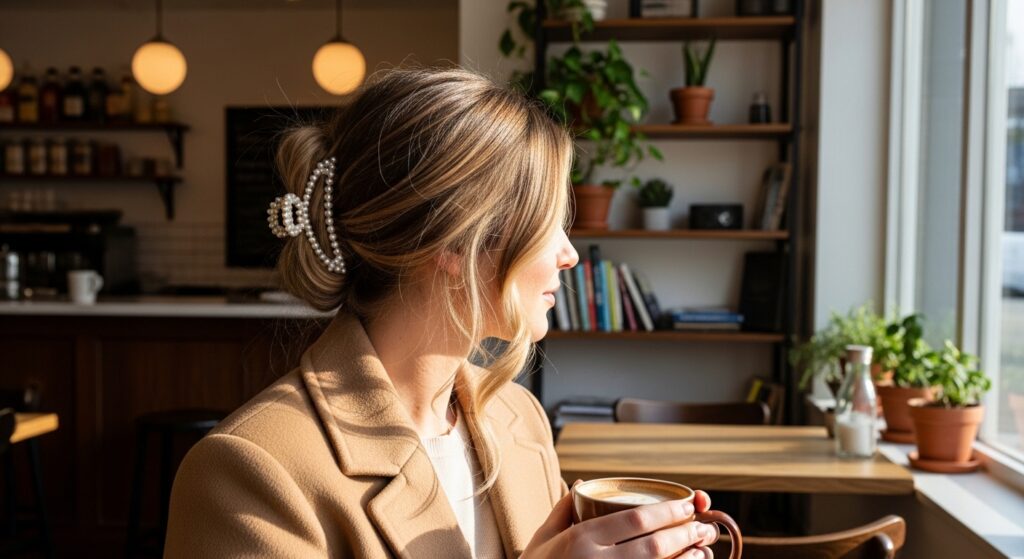 Old money hair whispers; it doesn’t shout. It’s about timeless, quality details. A pearl-adorned claw clip is the perfect accessory for this aesthetic.