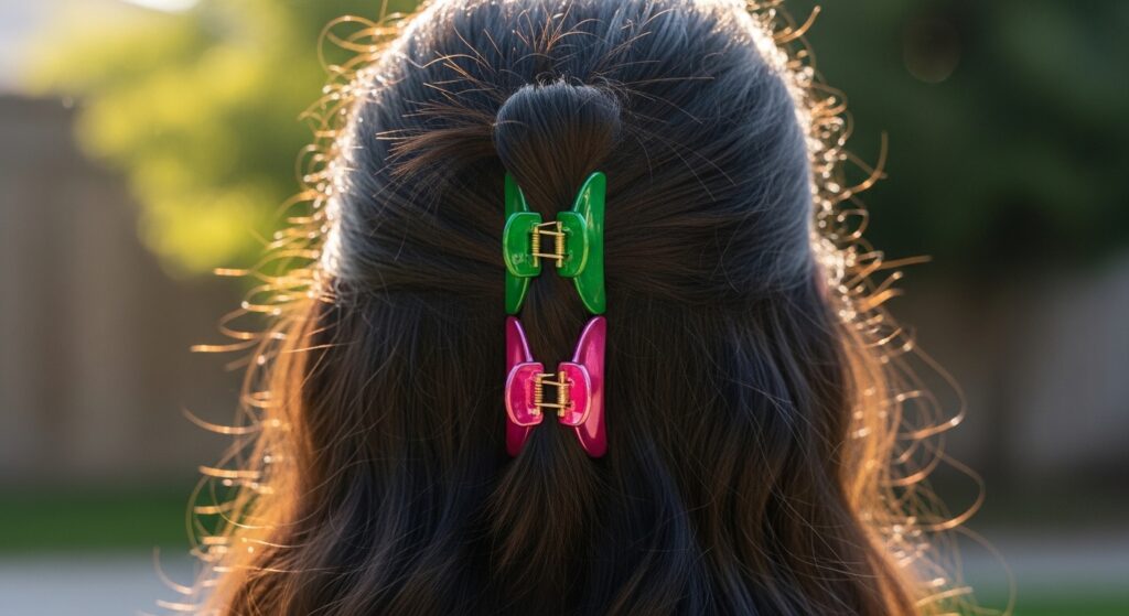 After styling your half-up, use 2-3 tiny, colorful claw clips to pin back random, smaller sections around the face or near the main clip.