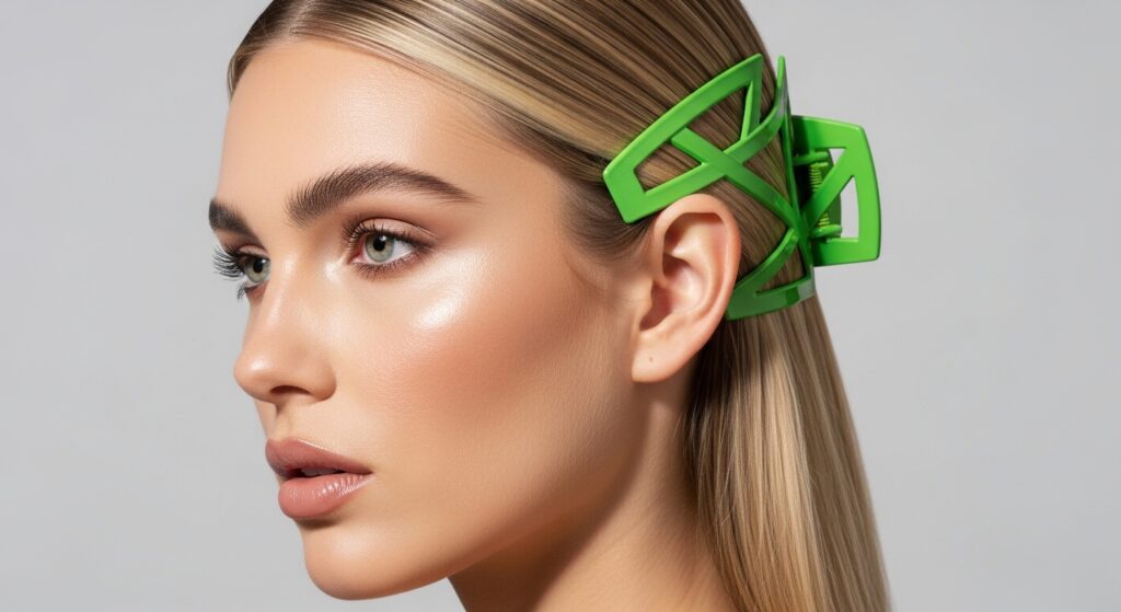 Use a clip in a bold, unconventional color or a futuristic shape. Neon, chrome, or geometric designs are perfect. Style your hair in a perfectly sleek blowout, then gather the top section.