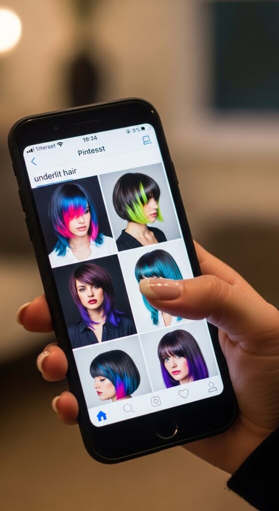 You’ve probably seen this trend already. Celebrities like Dua Lipa and Billie Eilish have rocked hidden bright colors. But the best inspiration is on platforms like Pinterest and Instagram—search “hidden hair color” or “underlighting.”