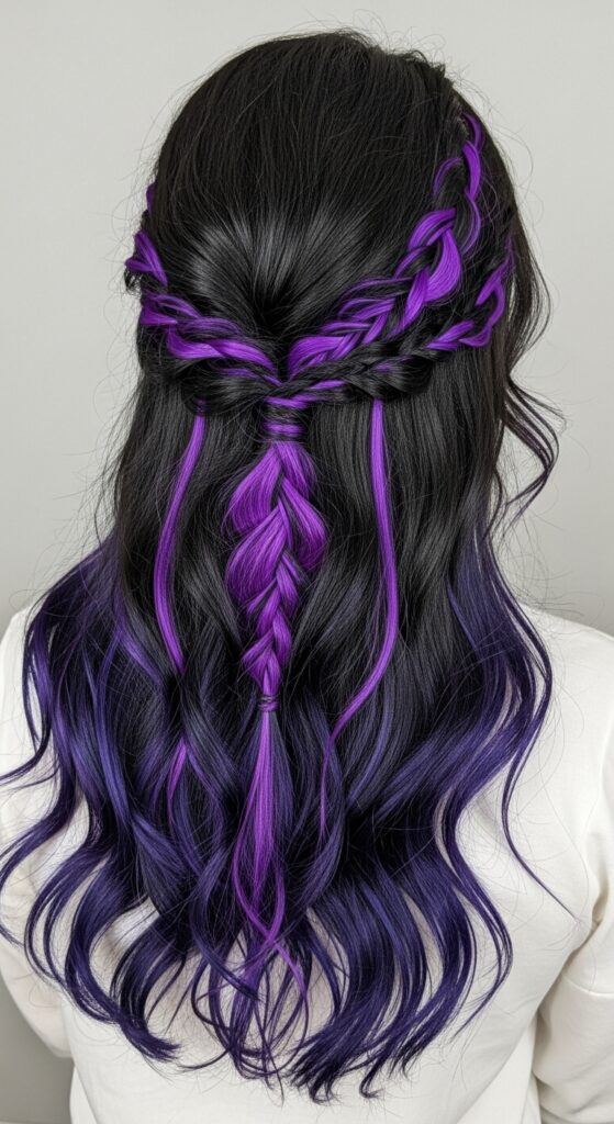Style it with soft waves, braids, or Victorian-inspired updos that strategically let the color peek through. It adds a layer of modern, almost digital mystery to a classic dark aesthetic. It’s less vampire, more cyber-poet.