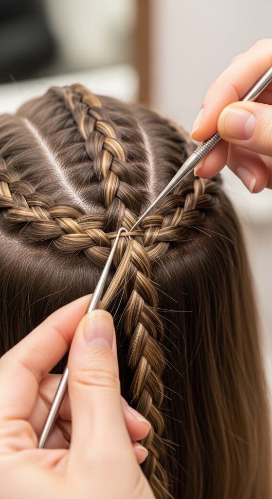 Use the crochet hook to catch a tiny piece of the extension and pull it through a loop in your base braid. Then, simply incorporate that pulled-through piece into your ongoing braid. It becomes part of the style instantly.