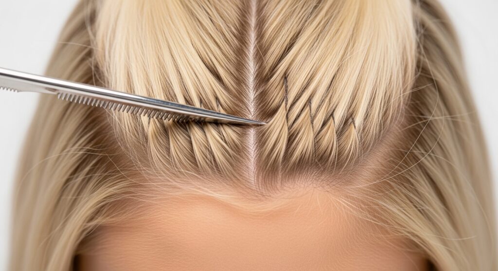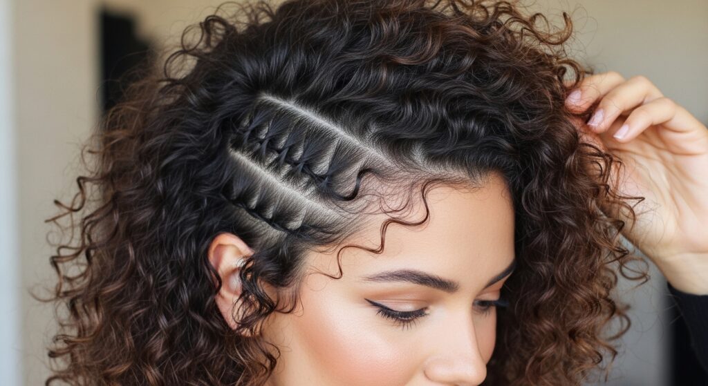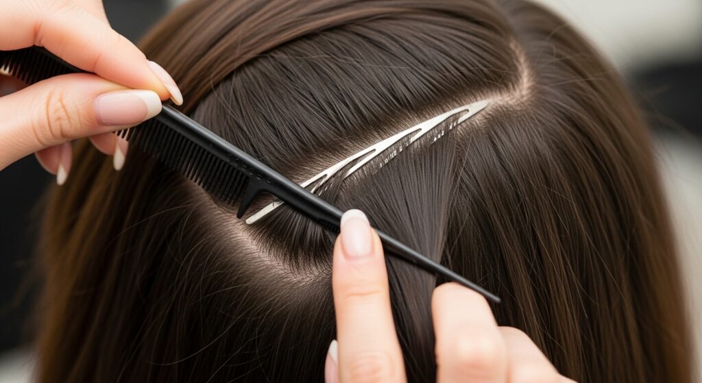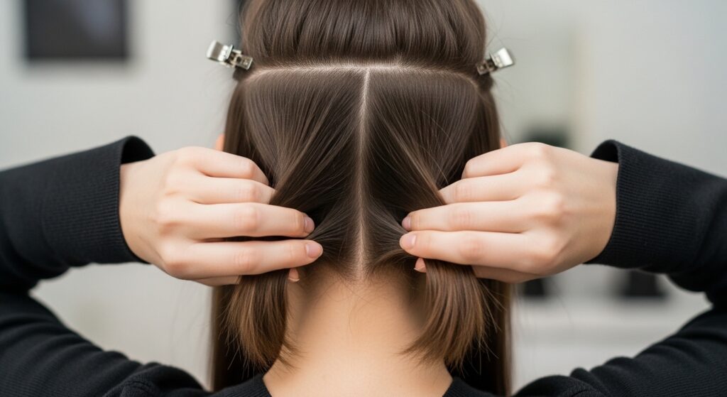 Once your zigzag part is done, you’ll see two distinct front sections framing your face. Gently clip these forward so they’re out of the way. These are your crown pieces.