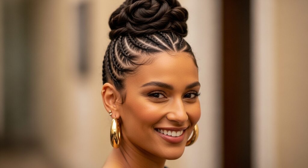 Big hoops, dramatic drops, or bold studs all work perfectly. The zigzag part and clean updo provide a cool, minimalist backdrop that lets your jewelry truly shine.