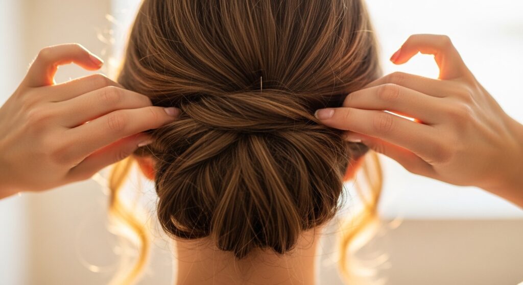 Take your gathered back hair and give it a gentle twist. Don’t twist it tightly all the way down. Just one or two turns to create a little structure. Then, coil the twisted length into a loose bun at the nape of your neck.