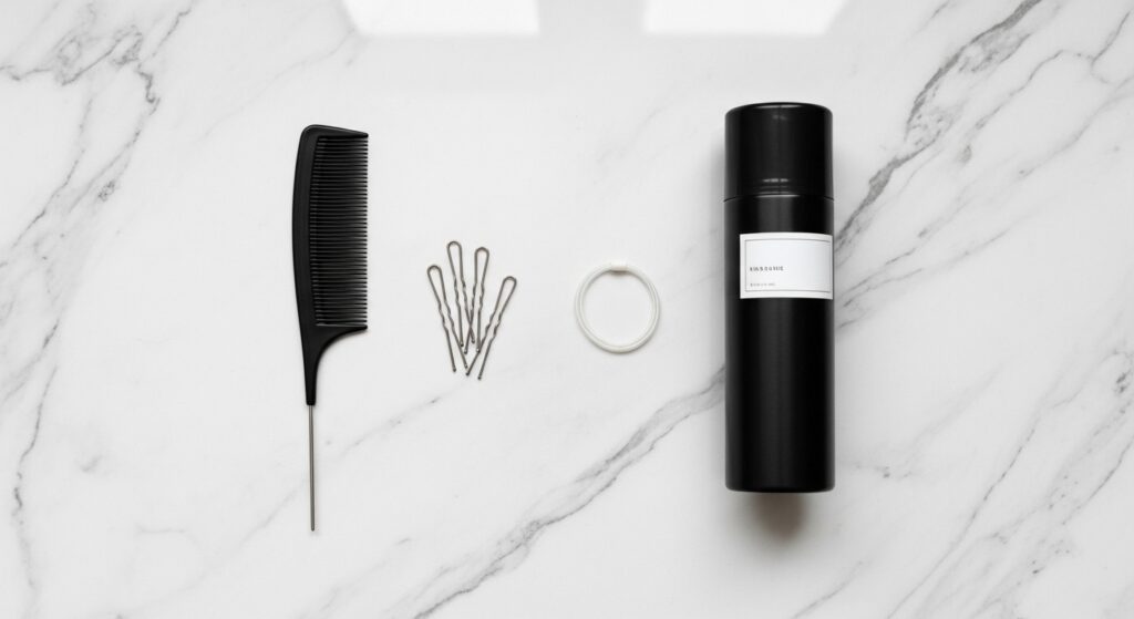 You don’t need a salon full of products. Just a few basics will get you there. First, a fine-tooth comb or a tail comb is key for creating a clean zigzag. A couple of hair elastics that match your hair color are a must.