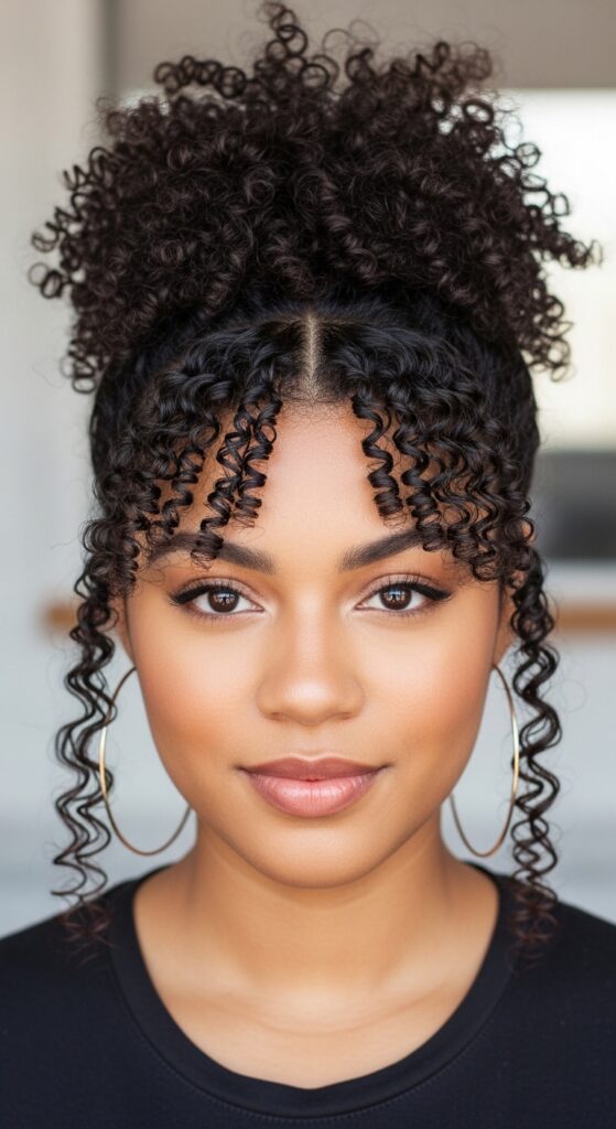 This style is stunning on curls. Gather hair into a high puff or bun. Let your natural curls form the petals!