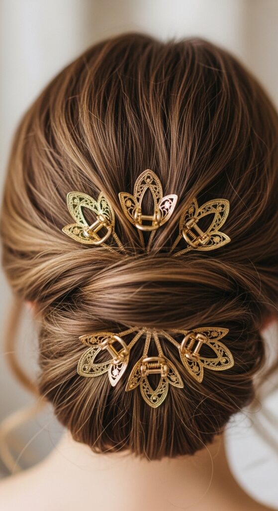 After creating your petal updo, use decorative mini claw clips to pin back a section on the side. It adds a functional jewel.