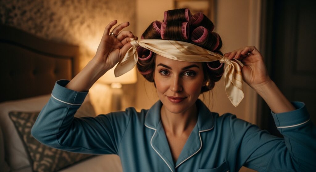 Once all rollers are in, I gently tie a silk scarf over my head or use a loose silk bonnet. This keeps everything in place and prevents the rollers from rubbing off on your pillow.
