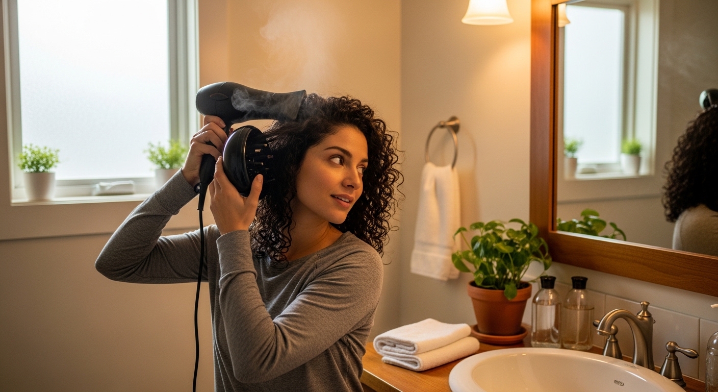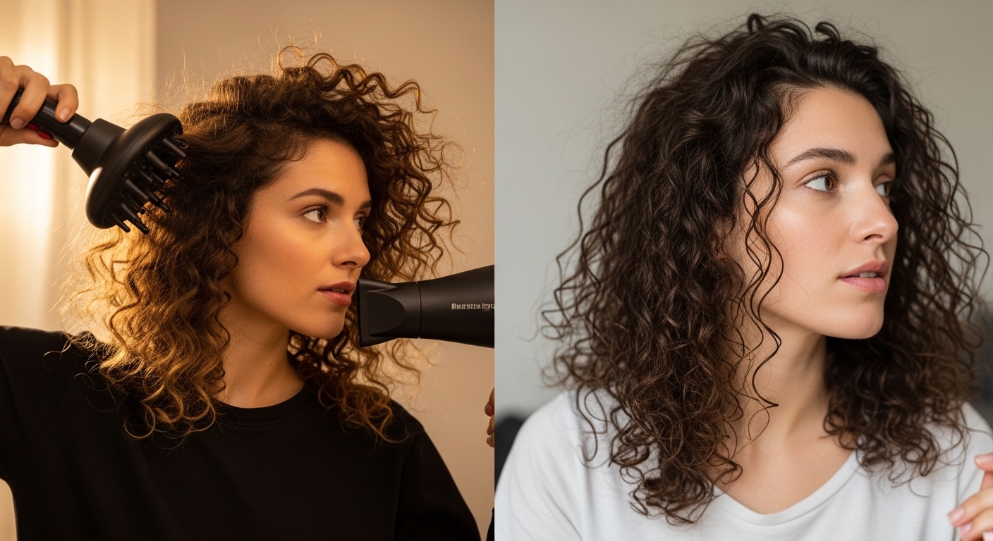 Diffusing boosts root volume and definition. Air-drying gives softer texture.