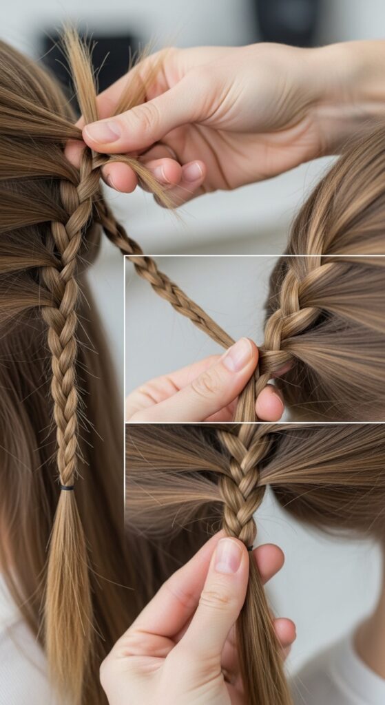 - Add this new hair to the strand you’re about to cross over. This is how you “climb” and build the ladder.